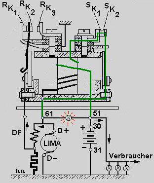 Lichtmaschine selbsttätig der Batterie zu- oder abschaltet, und den Spannungsregler, der