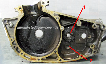 1-Schaftrad; 2-Lagerbuchse für Vorgelegewelle (der 3.Gang-Motor hat zwei Lagerbuchsen)