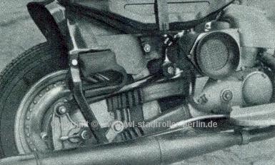Schwinge gelagert. Die hintere Schwinge wurde am Zentralrohrrahmen vermittels eines