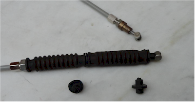Diese Alu-Tüllen wurden entfernt und durch eine ungeschlitzte Messingbuchse ersetzt. Diese haben ein durchgängiges M6 Gewinde hinein geschnitten. Messingbuchse und Stellschraube wurden auf den Bowdenzug gefädelt, fertig! Die Einstellung an den Armaturen war existent. |