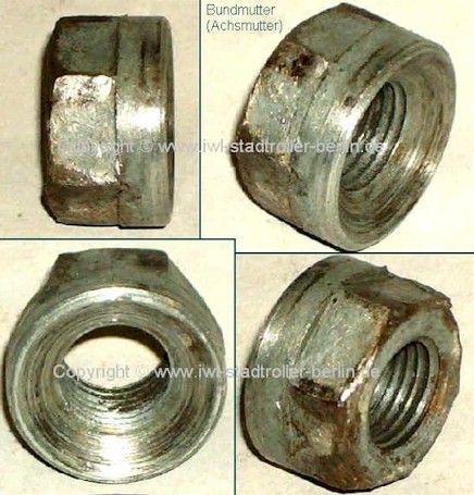 auf der Achse sind zwei Bundmuttern (rechts/ links) und eine 6-Kantmutter M14x1,5