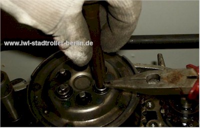 Federteller mit einem Spezialwerkzeug (11 MW 15-4) niederdrücken |